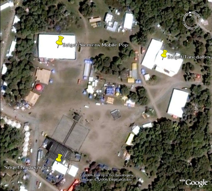 28 November 2006 (sziget) (1 comment)Szabi hívta fel a figyelmemet egy ördögi véletlenre: a Google Earth adatbázisában lévő műholdképek a Hajógyári-szigetről éppen a Sziget ideje alatt készültek. Jól láthatóak a nagyobb színpadok, sátrak, a jellegzetesebb alakúak, mint a Luminárium, a Cinetrip Labiritmus vagy a Magic Mirror, külön is felismerhetőek.