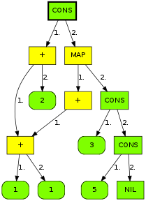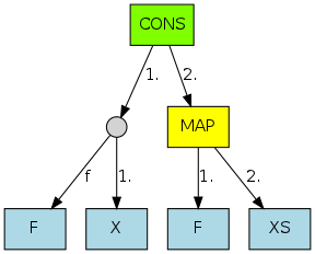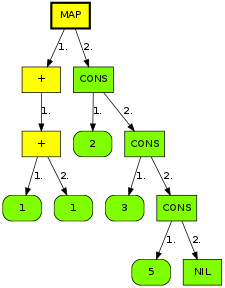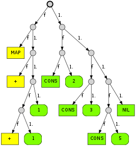 Reducing this entails instantiating the following graph (from the second case of map), with f bound to (+ (+ 1 1), x bound to 2, and xs bound to (cons 3 (cons 5 nil)). Note the explicit application node: we won't know the arity of f until it's bound to something.