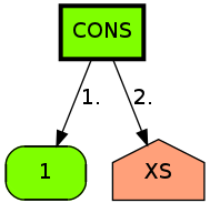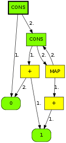 As you can see, the green boxes represent constructors (with rounded corners for primitive values), yellow ones are functions, and the small gray circles are function applications. There are no variables, since references are resolved when building this graph.