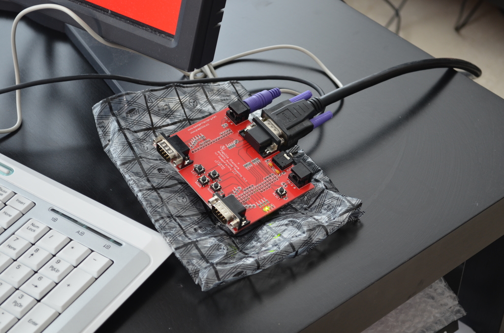 The FPGA board that I targeted is a Papilio One 500K, which has 500K... somethings called "system gates", and about 40KByte of SRAM. The Arcade MegaWing provides a D-sub 15 VGA connector and two PS/2 ports, among some other stuff that I am not using for this project.