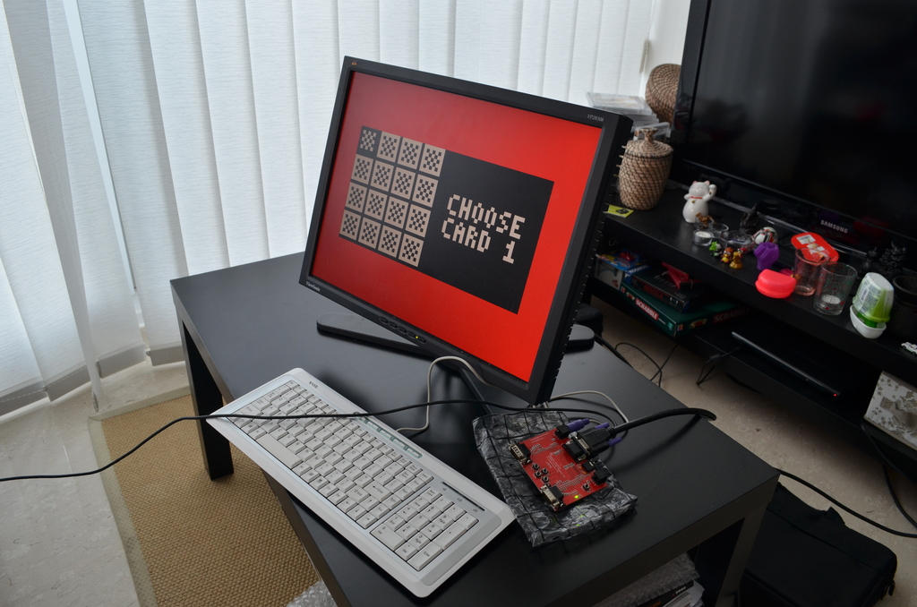 The home computer targeted by the original CHIP-8 spec only had a four-by-four keypad, so I am not 100% happy about using a PS/2 keyboard for the input. Maybe a later version could use a bespoke keypad connected to the unused pins of the LogicStart MegaWing. However, by using a PS/2 keyboard, I could not worry about the hardware side of things and just implement a decoder for the PS/2 protocol.