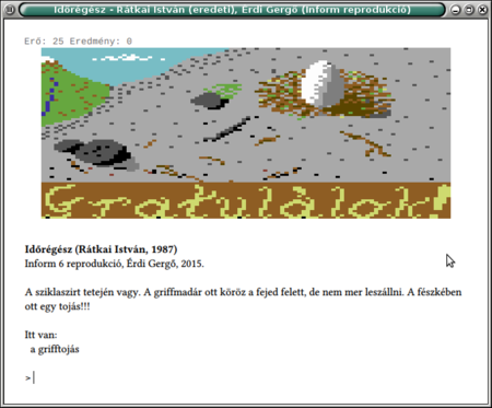 Mint mondtam, eredetileg ZMachine-re akartam megírni, de mint kiderült, az nem igazán van felkészülve nem-ASCII karakterekre: a latin-1 karakterek még úgy-ahogy működnek, de a latin-2 csak néhány interpreterrel. Kiderült viszont, hogy van egy hasonló, de sokkal modernebb virtuális gép szöveges kalandjátékokhoz: a Glulx. Ez már ígéretesebb: kezel unicode-ot is, úgyhogy semmilyen magyar ékezettel nem lehet problémája; az Inform 6 compiler ugyanúgy támogatja, mint a ZMachine-t; ráadásul még könnyedén támogat grafikát és hangokat is! De ekkor, az ismerkedési fázisban, az még ötlet szintjén sem szerepelt, hogy a képeket és hangokat is kiszedjem az eredeti programból.